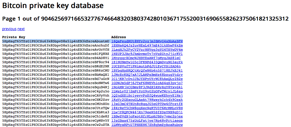 Что же на самом деле содержится на этом сайте? Генерируемые «на лету» страницы, на которых случайно сформированному секретному ключу (фактически, случайному числу) ставится в соответствие неиспользуемый Биткойн-адрес.