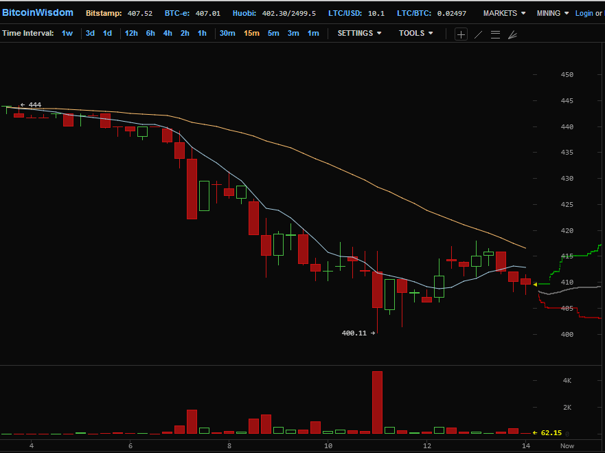 Очередной китайский негатив  вызвал резкое падение курса биткойна на мировых рынках вслед за китайскими. В пике падения курс в Китае снижался на 15% по сравнению с вчерашним днем на больших объемах торгов. Сейчас цена криптовалюты составляет около 370$ на торговой площадке Bitstamp и чуть ниже на BTC-e.