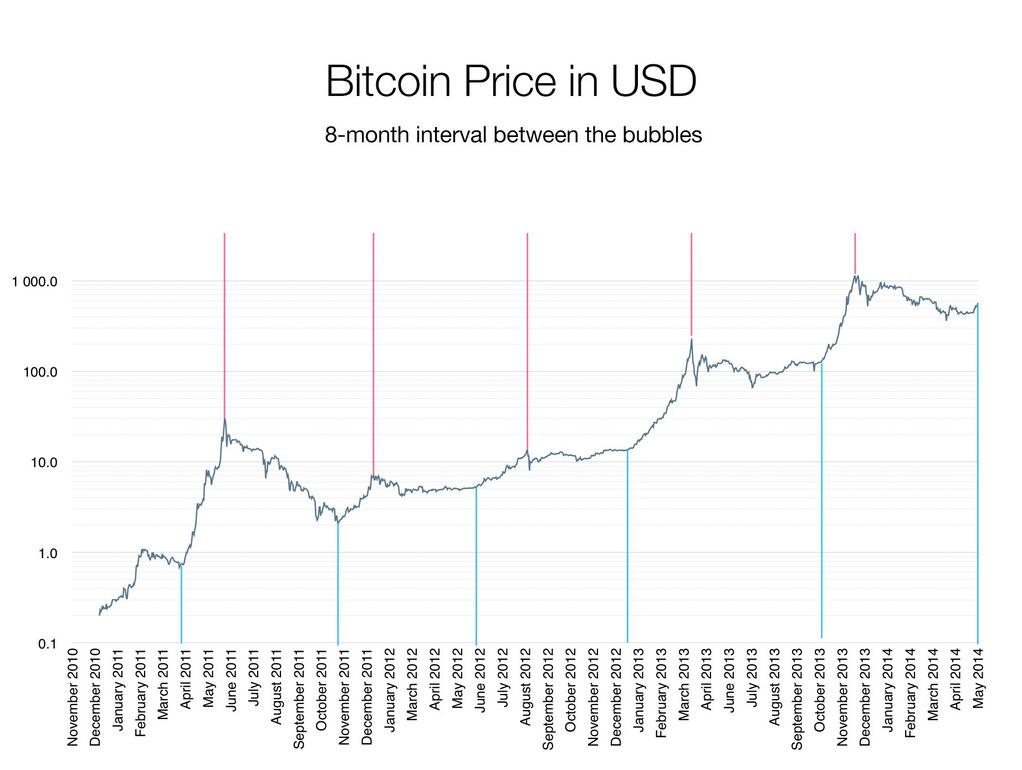 Курс биткойна растет в процессе резких взлетов, которые случаются в среднем каждые 8 месяцев