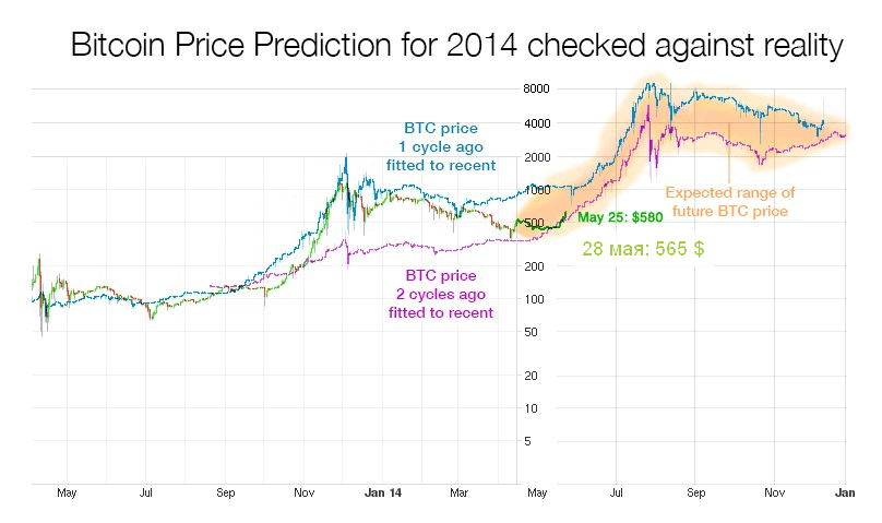 Если прогноз движения цены будет оправдываться и дальше, то в июне 2014 цена на биткойн будет колебаться уже в диапазоне 600-700 $, а в июле начнется ралли, которое закончится в августе или сентябре на отметке 2 500 $ за биткойн. Я не думаю, что в этом году цена уйдет выше, чем 3 000 $.