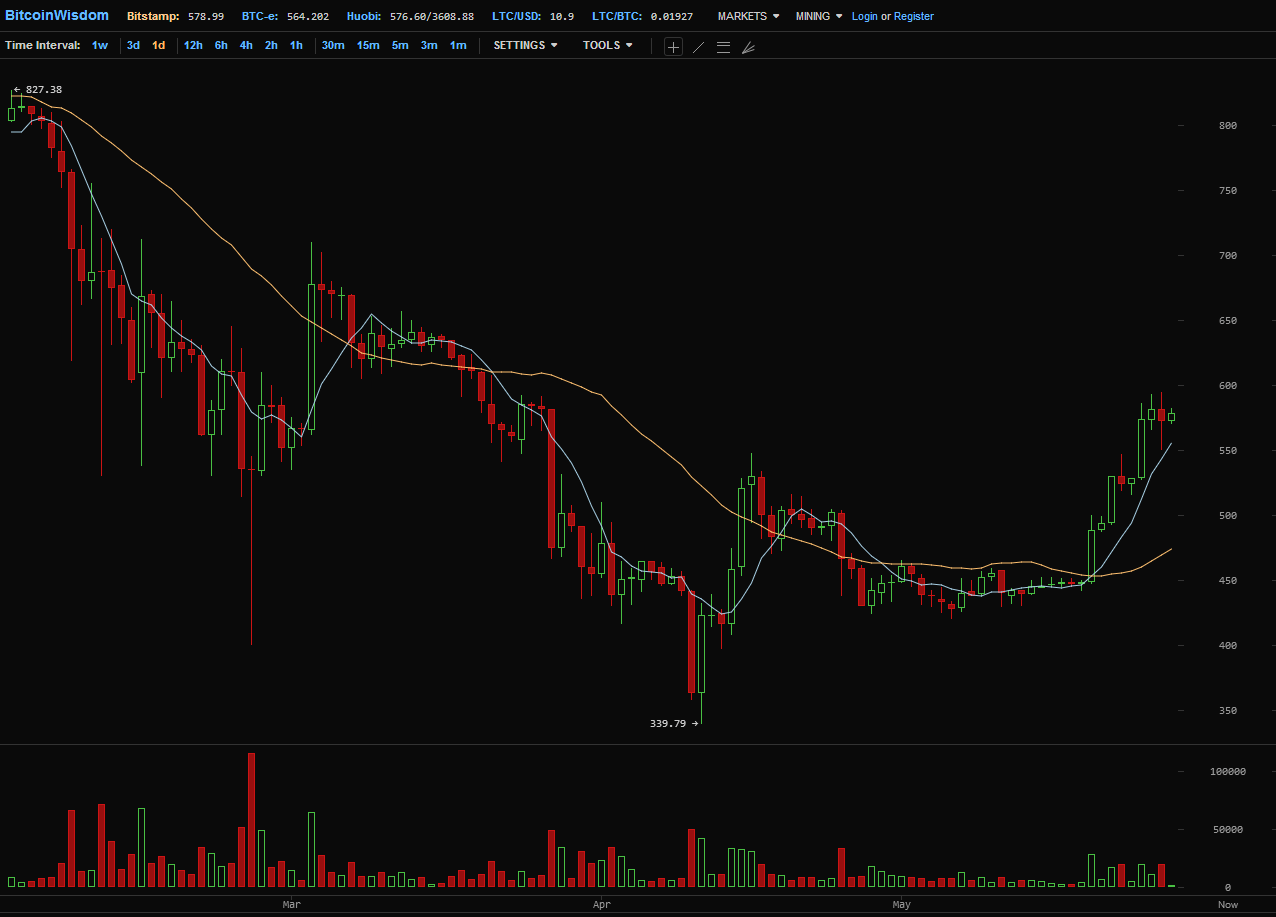 Я пометил зеленым цветом последние рыночные данные о цене. Как и ожидалось, цена сломала понижательный тренд и начала понемногу расти. Как видно из графика, цена не выходила за пределы обозначенного ранее диапазона и на данный момент находится почти в его середине. Цена открытия торгов на 28 мая составила 565 $.