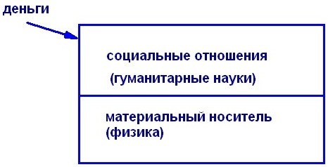 В первый взгляд здесь все понятно, кроме того, зачем вообще понадобилось составлять диаграмму (поди ж ты, какое ученое слово!) для самоочевидной вещи. Деньги нужны для специфической формы общения между людьми, и для этого они имеют какую-то вещественную, материальную форму: бумажки, монетки, пластик. Что тут непонятного?