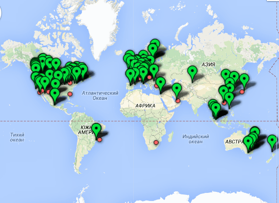 Взгляните на карту расположения биткойн-банкоматов. В данный момент на неё нанесена 121 работающая машина. При сборе данных о работающих банкоматах Coindesk опирается на публикации в прессе, на данные из открытых источников и на сведения от самих производителей и операторов биткойн-банкоматов. Исходя из этого, следует понимать, что карта не может быть абсолютно точной всё время. Итак, с этим небольшим отступлением, давайте взглянем на имеющиеся данные.