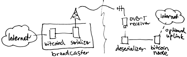 Уже почти два месяца компания Koodilehto продолжает эксперимент Kryptoradio: биткойн-транзакции транслируются на территорию Финляндии посредством цифрового телесигнала. Принимать такой сигнал может любое устройство с подходящим приемником и специальным ПО; охват составляет 95% населения страны (около 5 миллионов человек). Для передачи сигнала используется специально разработанный протокол, предназначенный для передачи небольшого потока информации по односторонним цифровым сетям.
