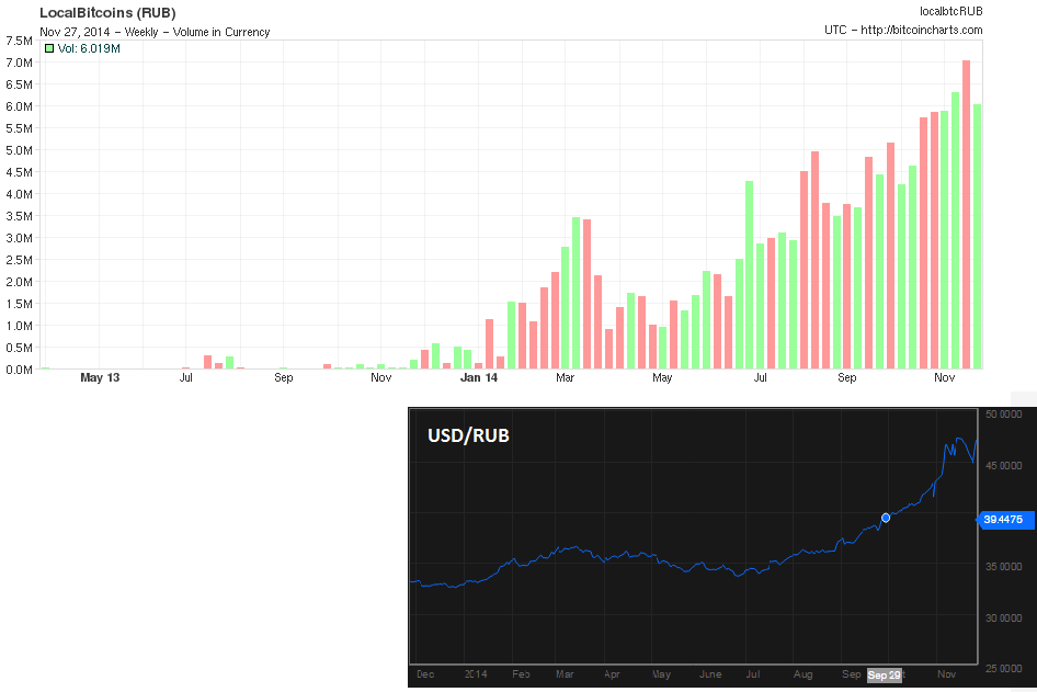 Это говорит о том, что на фоне падения курса рубля российские инвесторы начинают все больше доверять биткойну как средству сохранения своей покупательной способности. Как видно на рисунке выше, прослеживается достаточно четкая корреляция между падением рубля к доллару и ростом объема торгов на LocalBitcoins в российской валюте.