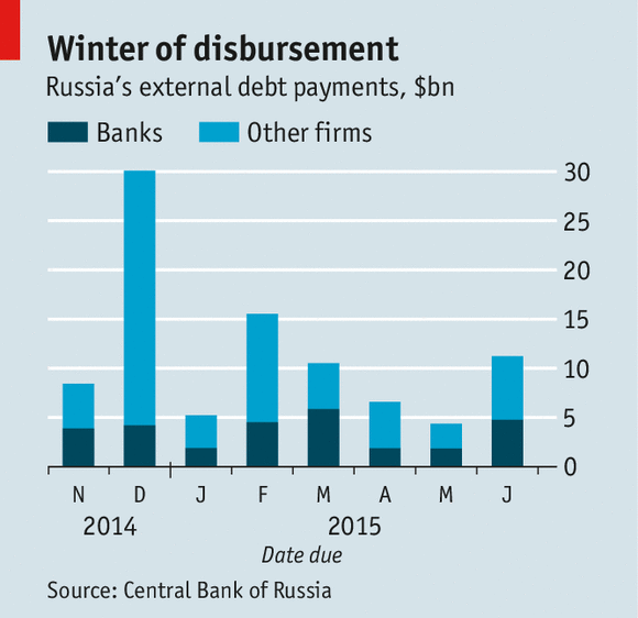 Существует еще ряд причин продавать рубли и покупать доллары. По данным центробанка, сейчас внешний долг российской экономики составляет более 120 миллиардов долларов, и сроки его погашения истекают в следующем году. Примерно треть этого долга принадлежит банкам, а оставшиеся две трети — другим компаниям. Некоторые из этих компаний — в особенности российские энергетические гиганты — получают прибыль в долларах. А большая часть остальных компаний, в том числе банки — нет. Поскольку санкции мешают многим российским компаниям занимать средства за границей, чтобы рефинансировать свои долларовые задолженности, возникает постоянный спрос на доллары. Учитывая то, что сроки платежей в основном истекают в декабре, это может привести к еще одному сокрушительному удару по рублю до конца года.