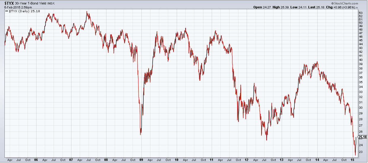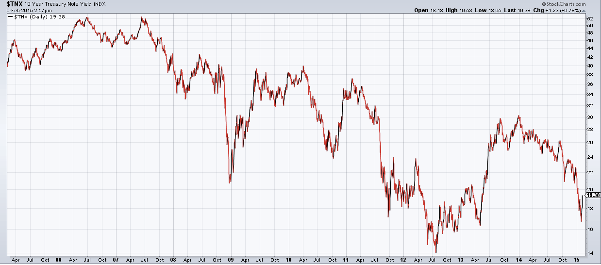 Такая ситуация не вписывается в рамки глобального экономического восстановления, не так ли? Еще большее недоумение вызывает доходность 10-летних облигаций (на графике ниже). В настоящее время она находится вблизи исторического минимума. Разве это признак восстановления?