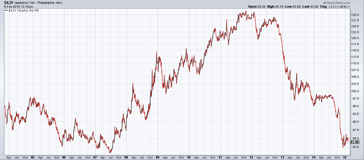 Европа и Япония активно пытаются предотвратить дефляцию ради роста своих экономик. Европейский центральный банк (ЕЦБ) и Банк Японии (BOJ) – активные сторонники практики количественного смягчения. Ниже приведены графики курсов евро и йены.