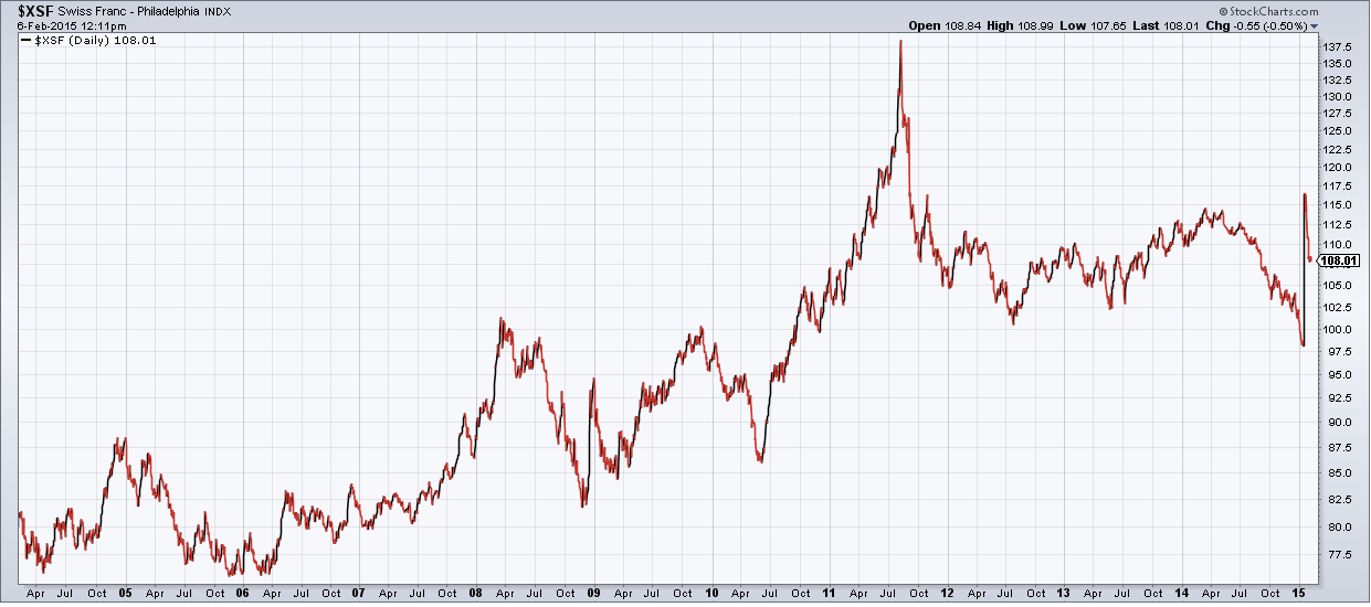 Швейцарский Национальный банк (SNB) был знаком с этой проблемой не понаслышке. Скупка иностранной валюты ради сохранения привязки к евро стала обходиться слишком дорого, и SNB пошел на экстраординарный шаг. 15 января было объявлено об отказе от политики сдерживания курса франка уровнем 1,20 за евро. Это решение стало неожиданностью для глобальных рынков, и его последствия ощущались по всему миру. Пожалуй, резкий скачок курса франка стал самым большим потрясением валютного рынка в начале 2015 года. Динамику курса вы можете увидеть на графике ниже (“потолок” для франка был установлен в сентябре 2011 и снят в январе 2015).