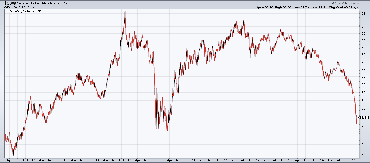 История изменения курса канадского доллара практически идентична (на графике ниже). Канада, как один из крупнейших в мире производителей энергии, неразрывно связана с этим сектором экономики. Для борьбы с негативными последствиями падения цен на нефть 21 января текущего года Центробанк Канады снизил процентную ставку с 1 до 0,75%.