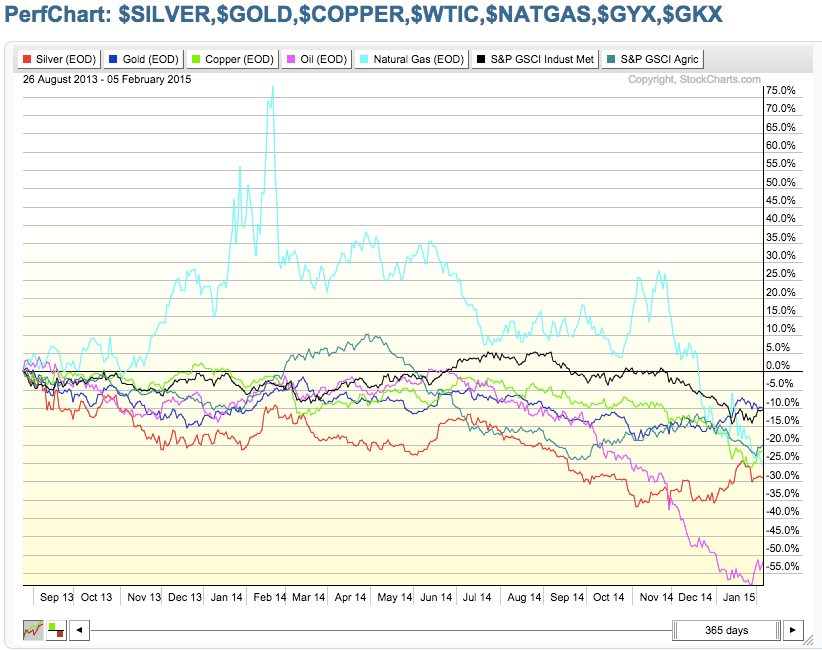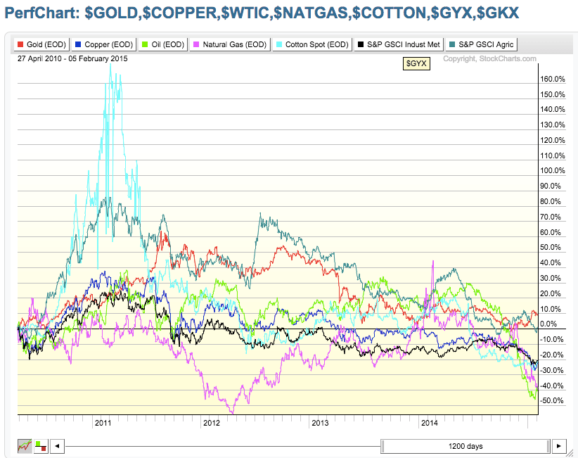 В прошлом году ФРС США объявила о завершении программы количественного смягчения. Выглядит, будто острая фаза кризиса пройдена, ситуация в экономике устойчивая, доллар бьет рекорды, а ключевые индексы растут. Однако есть весьма любопытная зависимость, а именно: отрицательная корреляция доллара США с рынком биржевых товаров. Стоимость сырья существенно снизилась с 2011 года. Ниже приведены две схемы цен на сырьевые товары, одна охватывает последний год, а вторая – период с 2011 года до настоящего времени. За исключением золота, падение большинства товаров было достаточно стремительным.