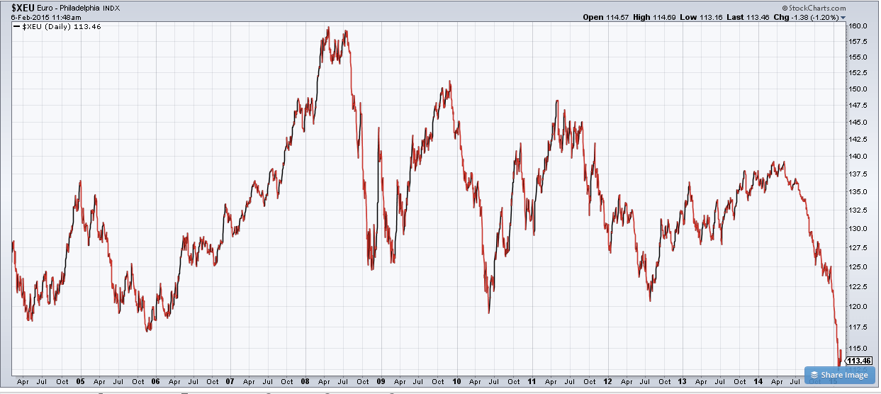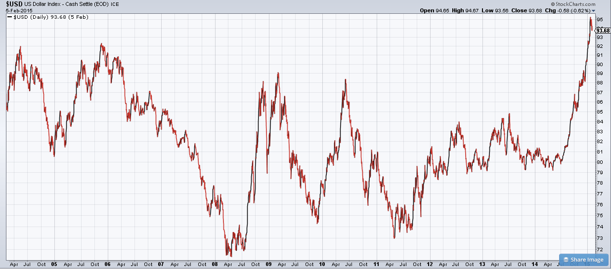 Термин “валютная война” получил известность в 2010 году, когда бразильский министр финансов Гвидо Мантега заявил, что ослабление доллара США, вызванное количественным смягчением, вынудило другие страны принимать срочные меры по предотвращению снижения экспортной конкурентоспособности. Это привело к так называемой “гонке на дно”, в которой все страны старались ослабить национальные валюты настолько быстро, насколько это возможно. Теперь перенесемся в сегодняшний день. Как видно на диаграмме ниже, ситуация противоположная. В январе 2015 года американский доллар достиг своего 11-летнего максимума по отношению к ряду валют, причем, основной рост пришелся на лето 2014.