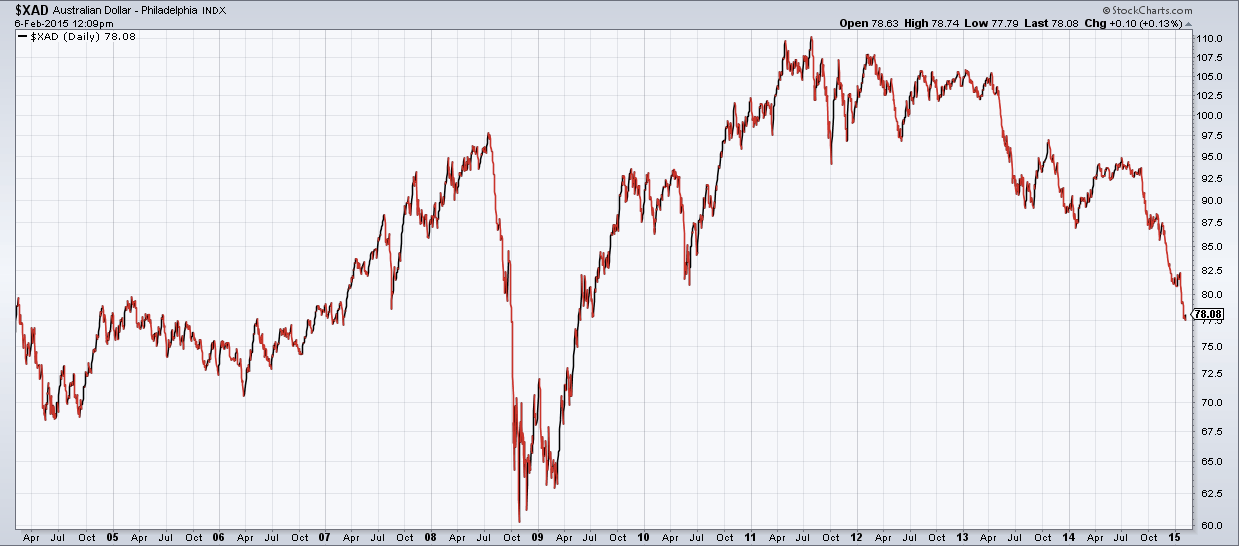 Любопытно, что в 2011 году, в то время как доллар США достиг своего дна, практически все остальные валюты существенно выросли. Это прекрасно иллюстрирует график австралийского доллара, который приведен ниже: национальная валюта зеленого континента достигла своего максимума в 2011 году и с тех пор только падает. Австралийский доллар известен большими рисками при торговле, во многом это обуславливают цены на биржевые товары и влияние Китая. В целях стимулирования национальной экономики, Центробанк Австралии пошел на снижение процентной ставки впервые за 18 месяцев. Результат таких действий прекрасно виден на графике как постепенное “сползание” курса вплоть до сегодняшнего дня.