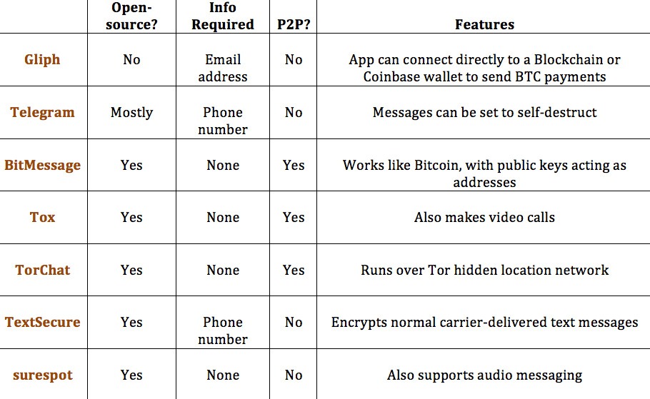 Gliph — не единственный сервис, который претендует на лидерство в сфере защищенного обмена сообщениями. Вот сравнительная таблица лишь некоторых проектов в этой области, которые на слуху: