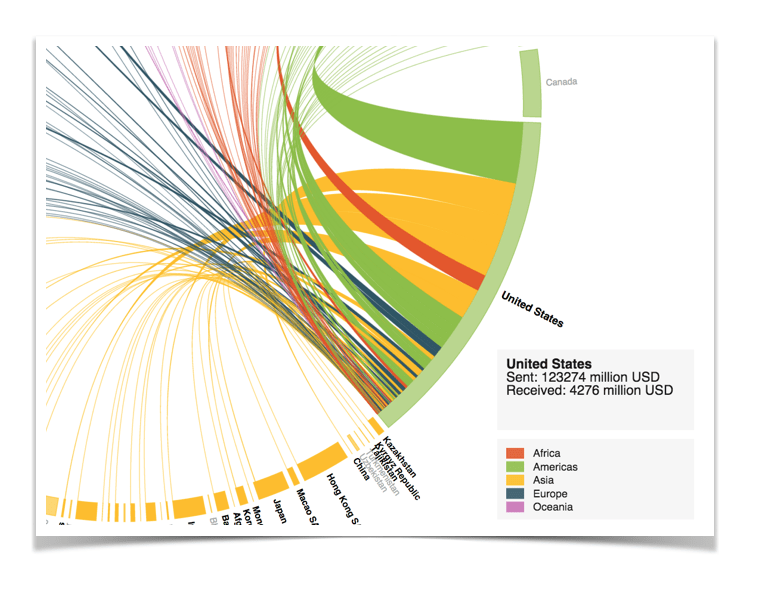 Роксана Торре публикует действительно информативную инфографику обо всем, связанном с денежными переводами. Она использует данные о двусторонних переводах Мирового Банка в 2012 (скачать) и превращает ее в интерактивную инфографику, описывающую отправку и получение денежных переводов для каждой страны.