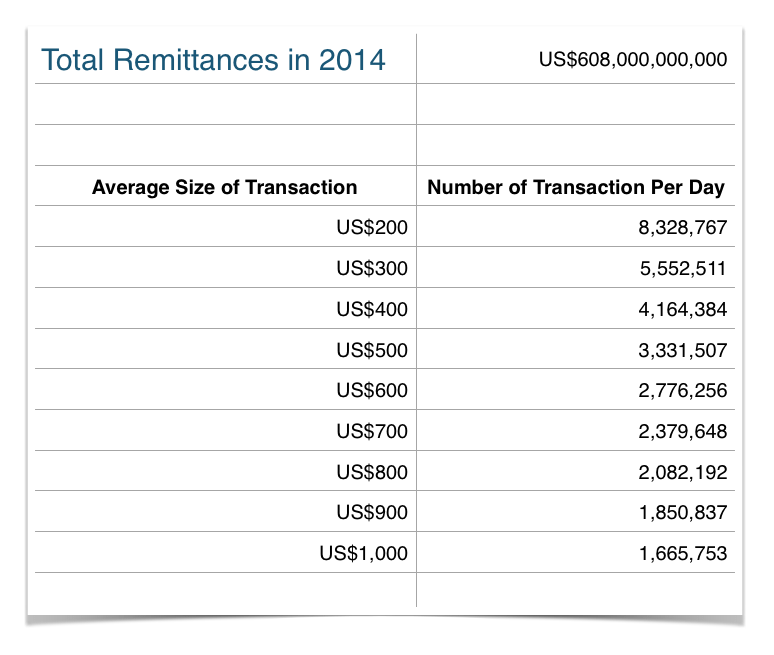 Для сравнения, если смотреть на денежные переводы из Ближнего Востока в Южную Азию и Филиппины — там больше, чем 100,000+ транзакций в день. Переводы, входящие в Индию, одолевают отметку в 500,000+ в день. В мировом масштабе трудно судить про цифры, но следующая таблица может дать вам общее представление о том, насколько велик рынок (и он только увеличится с добавлением переводов малой стоимости, то есть переводов менее $50)