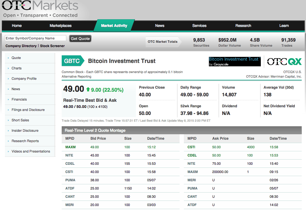 Первое, что мы можем увидеть, посмотрев на текущие котировки и биржевой стакан на площадке OTCQX (см. картинку в самом начале статьи) — это сузившиеся спреды. Вместо дикого разрыва в сотни и даже тысячи долларов (в пересчете на курс биткойна) спред сейчас составляет вполне приемлемый 1 доллар по акции (то есть около 10 долларов по курсу). Стакан тоже вполне живой и динамичный, примерно десяток участников-брокеров двигают заявки, видимо, как маркетмейкерские, так и клиентские.