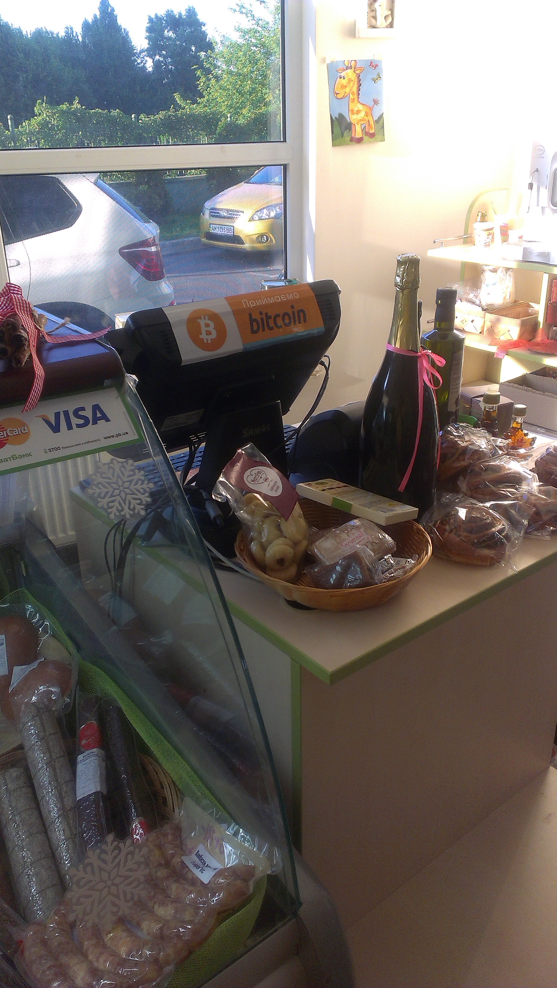 IMAG1692В городе Киеве с 23 июня 2015 года частный магазин «Натуральные продукты» начал прием криптовалюты Bitcoin на кассе. Магазинчик расположен на территории ЖК «Изумрудный» (закрытого типа) — всем клиентам из столицы и других областей необходимо на шлагбауме сказать: “в магазин продуктов”, после чего можно будет проезжать. Адрес магазина: г. Киев, ул. Механизаторов, дом 2.