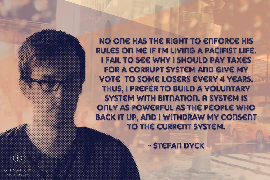 Я убежден, что, если я живу мирно, не причиняя никому вреда, никто не имеет права навязывать мне свои правила, и я не понимаю, почему я должен платить налоги коррумпированной системе и каждые четыре года отдавать свой голос (читай «власть») каким-то лузерам. Я предпочитаю работать над созданием добровольной альтернативы вместе с Bitnation. Сила Системы зиждется на людях, которые ее подпирают, и я забираю свой вклад в нее.