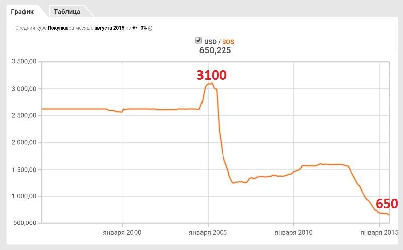 сомалийский шиллинг сомали деньгиЕсли сравнить шиллинг с гривной, которая при живом ЦБ в 1996-м году стоила 1,76 грн за доллар, то сомалийский шиллинг стал дороже в 18 раз! Сама гривна 96-го года стоит как 20 гривен 15-го года. Иными словами, украинцы стали беднее во много раз из-за деятельности чиновников в ЦБ, что ежегодно убеждающие публику в том, что монополия ЦБ — это оплот стабильности «национальной» валюты. Но, как видите, графики говорят совершенно о другом.