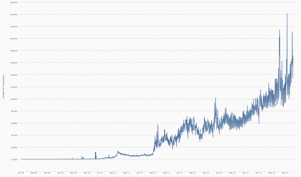 На самом деле, график, показывающий рост биткойн-активности, не обязательно означает, что большое количество людей использует цифровую валюту для покупки носков, продуктов или приложений. В начале 2014 года компания Overstock.com начала принимать платежи в биткойнах, став одним из крупнейших онлайн-ритейлеров, принявших такое решение. Однако, по данным, переданным представителем компании Джадом Бэгли (Judd Bagley), спустя два года биткойн-транзации составляют всего от 0,05 до 0,1 процентов продаж компании. График Армстронга показывает общее количество транзакций в биткойн-сети – всемирной сети компьютеров, подключенных к интернету, управляющих цифровой валютой – и здесь включено любое движение биткойна из одного места в другое, а не только оплата за товары и услуги.