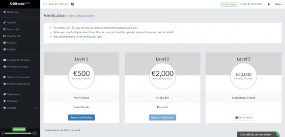 Сразу после создания аккаунта устанавливается ежемесячный верхний предел в €200. Подтверждение email-адреса позволит увеличить лимит до €500. Далее эту цифру можно поднять до €2000, однако для этого будет необходимо пройти процедуру подтверждения личности путем отправки копии документов (данная мера обусловлена законодательством ЕС). Если же и этого окажется недостаточно, то лимит можно увеличить до €50 тыс., для этого будет необходимо созвониться по скайпу с представителем сервиса. Для ознакомительных целей вполне достаточно пройти первый этап верификации.
