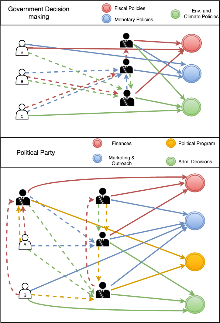 Давайте рассмотрим схему более подробно, чтобы во всем разобраться. Давайте рассмотрим эту схему на примере правительства, пример политической партии будет аналогичным. Всего есть 6 избирателей, 3 из которых взяли на себя ответственность быть делегатами. Как было указано выше, существует 3 типа вопросов (3 экспертные области): фискальная политика, монетарная политика, климат и окружающая среда.