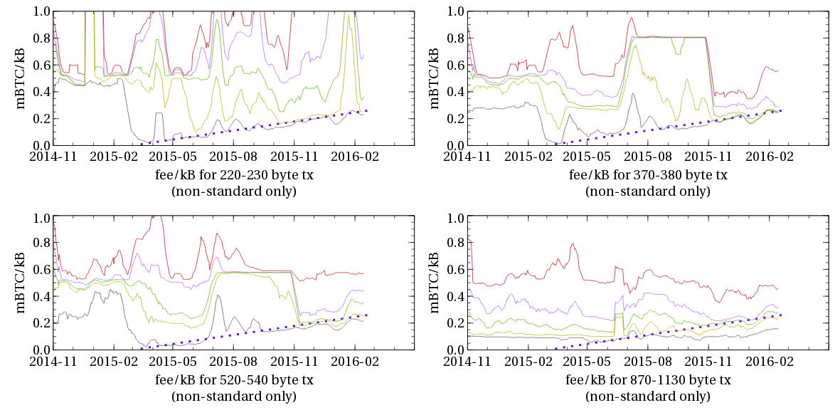 Отсюда видно, что по большому счету, количество транзакций каждого типа увеличивается, и что доля транзакций, платежи за которые были иными, чем стандартные, так же увеличивается. Однако, так же стоит отметить, что доля транзакций с тремя вводами с использованием нестандартных платежей фактически снизилась в ноябре — что, вероятно, указывает на то, что многие пользователи (или разработчики и сервисы кошельков, используемых многими пользователями) попросту временно увеличили стандартную оплату, пока их беспокоил стресс-тест, и вернулись к прежним стандартным значениям, когда беспокойство утихло, вместо того, чтобы перейти на использование кошельков или алгоритмы, которые рассчитывают оплату динамически. Но в любом случае, к ноября 2015 года мы имеем по крайней мере около тысячи транзакций в день каждого из размеров, даже после того, как исключили стандартные сборы.
