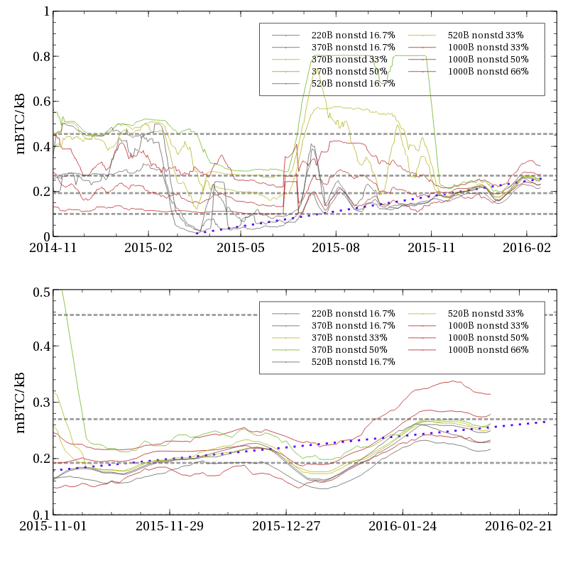 Наблюдается интересное явление: когда рыночная цена уходит выше любой серой пунктирной линии, транзакции соответствующего размера, которые платят стандартную комиссию 0,1 mBTC становятся менее прибыльными для включения в блоки майнерами, чем транзакции, которые платят рыночную цену. В определенном смысле это вызывает «момент оплаты», упомянутый ранее. То есть, при рыночном уровне платежей выше 0,1 mBTC/КБ, транзакции размером около 1000 байт, за которые платят 0,1 mBTC, в общем случае будут испытывать задержки. Судя по графику, для рассматриваемых на нем транзакций такое событие уже наступало дважды — событие оплаты в июле 2015, когда 1000-байтные транзакции, за которые платили стандартную сумму комиссии начали регулярно испытывать задержки вследствие того, что рыночная стоимость стала превышать 0,1 mBTC/КБ (то есть, оплату 0,1 mBTC деленную на 1KB размера транзакции), и следом случился второй момент оплаты в ноябре, который затронул транзакции с 3 входами и 2 выходами, вследствие того, что рыночная цена превысила 0,19 mBTC/КБ (то есть, 0,1 mBTC деленное на 0,52КБ). В соответствии с графиком, несколько линий тренда колеблются вокруг 0,27 mBTC/КБ, знаменуя скорое наступление третьего «момента оплаты», когда 370-байтные транзакции (то есть, с 2 входами и 2 выходами) со стандартными платежами за транзакцию начнут испытывать задержки подтверждения.