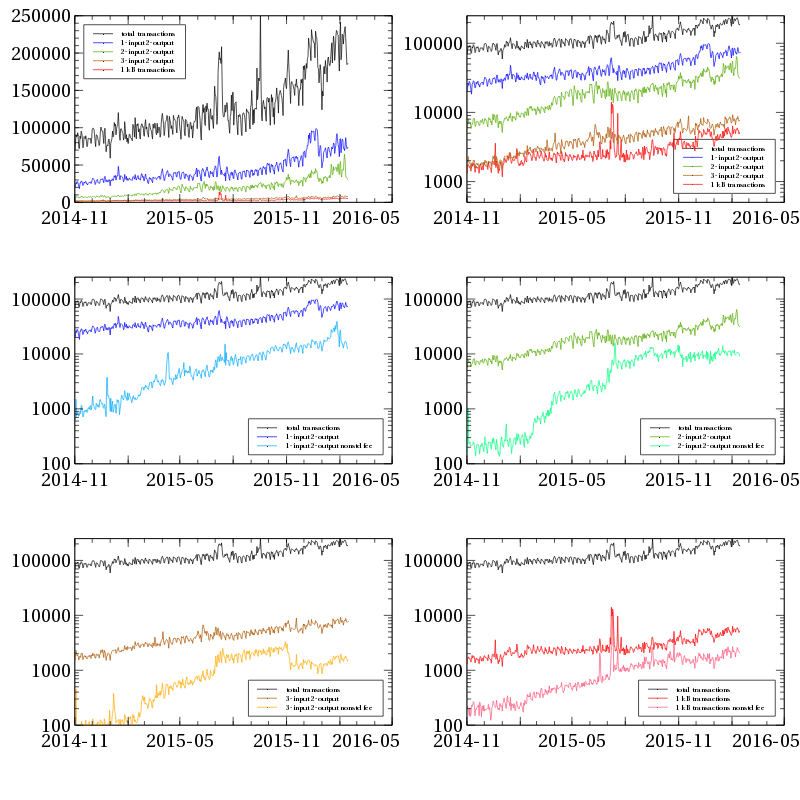 Здесь было бы неплохо убедиться, что мы не рассматриваем недостаточно большое количество транзакций, когда откинули транзакции со стандартными платежами 0,1 mBTC. Если построить графики с количеством транзакций по типам (то есть — общее количество транзакций, 220-байтные транзакции (1 вход, 1 выход), 370-байтные транзакции (2 входа, 2 выхода), 520-байтные транзакции (3 входа, 2 выхода), и 1-килобайтные транзакции, то можно увидеть, что их количество увеличивалось в течение прошедшего года, и что количество мелких транзакций значительно превышает количество больших. Обратите внимание на то, что ось ординат на левом верхнем графике представлена в линейном виде, в то время, как на остальных графиках она логарифмическая — так что каждое деление по вертикали показывает десятикратное увеличение количества транзакций в день. Не накладывалось никакого сглаживания / усреднения: