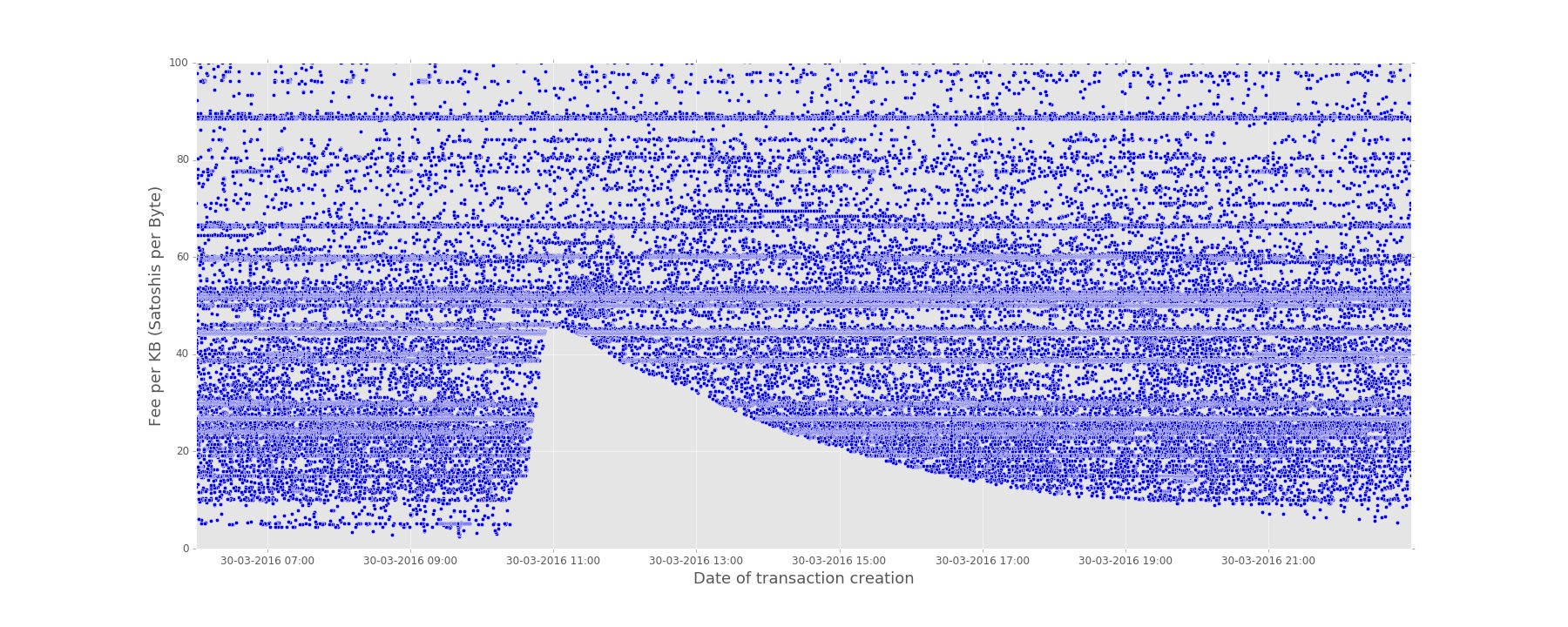 В более поздних версиях bitcoind (0.12+) при приближении размера пула к объему доступной памяти узел задает минимальную комиссию. Транзакции, в которых комиссия на 1 КБ данных не достигает этого порога, немедленно удаляются из пула, после чего в пул допускаются только транзакции с достаточной комиссией.