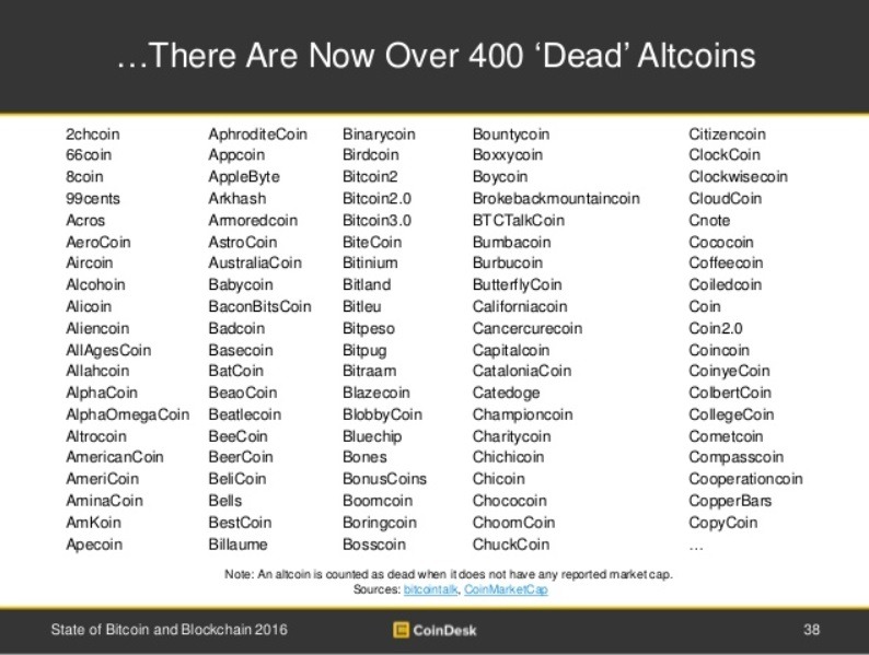 Несмотря на популярность явления, многие альтернативные криптовалюты тут же канули в Лету (сегодня их рыночная ценность не поднимается выше 0$). В 2015 году был представлен отчет CoinDesk State of Bitcoin and Blockchain, в котором насчитывается до 400 “мертвых” альтернативных монет. Это вполне ожидаемо, так как конкурировать с Bitcoin если не невозможно, то крайне сложно, ведь эта система была первопроходцем и, собственно, помогла закрепить в обществе само понятие криптовалюты.