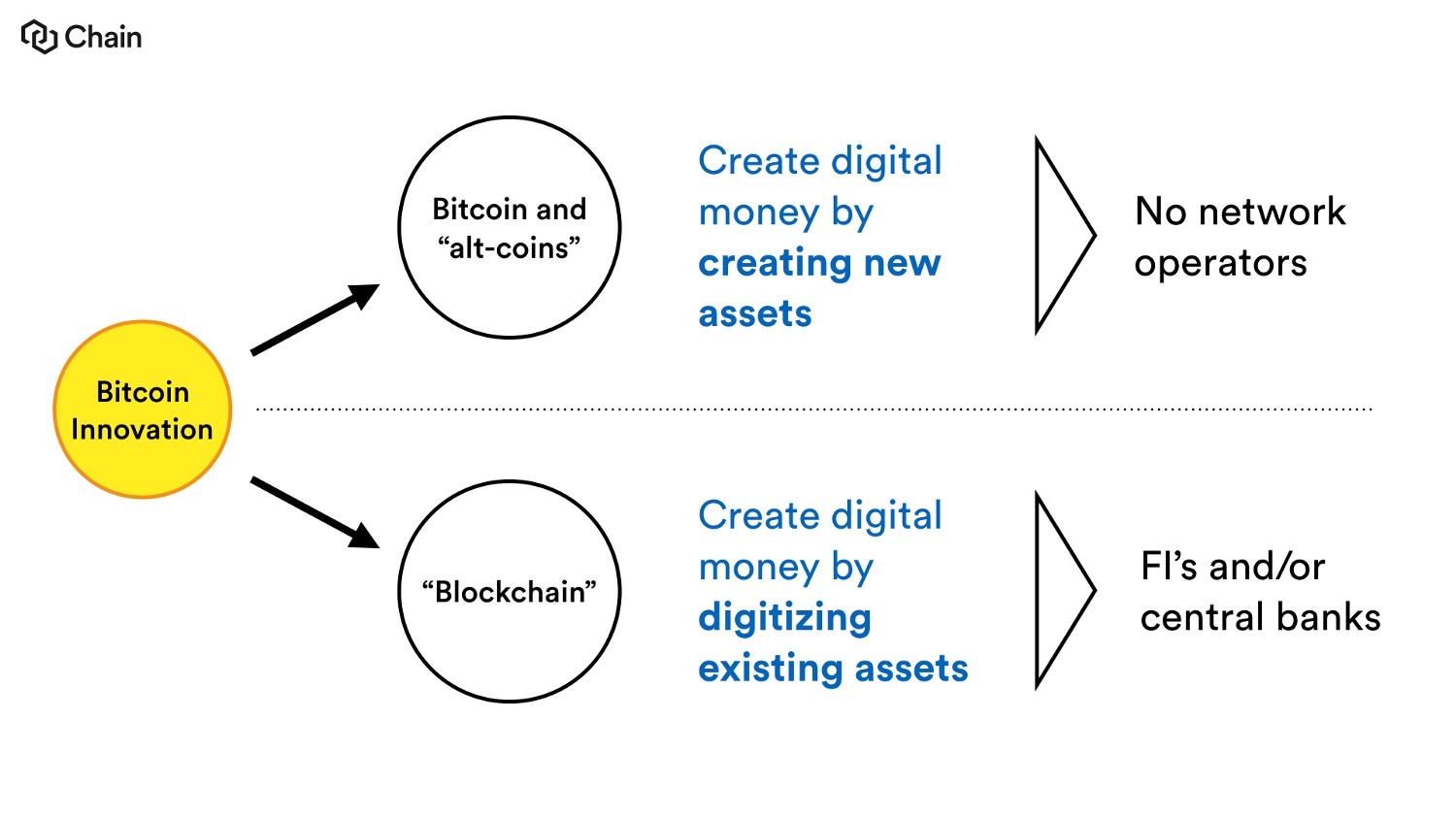 Стрелка вниз ведет к промежуточному этапу «создание цифровых денег путем оцифровки существующих активов». Это совершенная чушь. Единственное, что можно здесь предложить, это сохранить активы с порядковыми номерами в базе данных, и ничего больше. Заметьте также, что верхняя ветвь диаграммы завершается фразой «нет сетевых операторов», что делает ее похожей на тупик. На самом деле верно обратное: эта ветвь объединяет всех на Земле, у кого есть компьютер; все люди могут присоединиться к биткойн-сети и использовать Биткойн как деньги без разрешения центробанков. Эта диаграмма в корне неправильно представляет разницу между биткойн-сетью и фуфломицином «блокчейн без Биткойна».