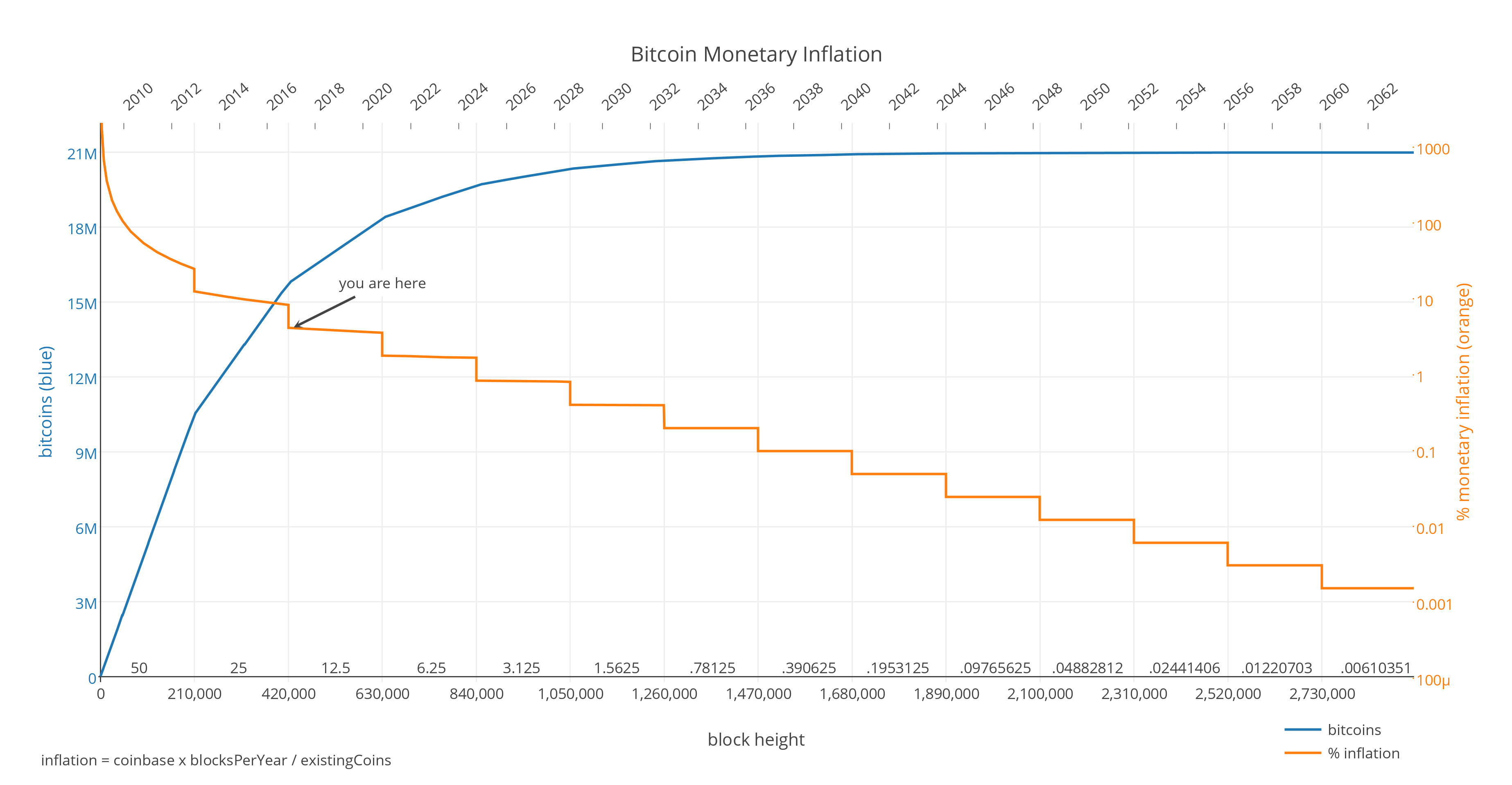 С точки зрения математики уровень инфляции биткойна должен со временем уменьшаться с фиксированной скоростью, так как количество биткойнов в обращении постоянно растет с заданной скоростью, пока не достигнет 21 млн.