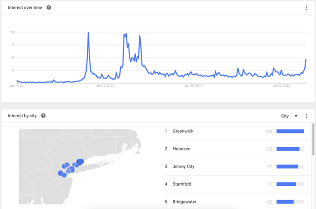 Графики ниже демонстрируют интерес к биткойну в поисковых запросах Google, а так же распределение запросов по городам. Там наблюдается повышенный интерес со стороны сообществ хедж-фондов вблизи Нью-Йорка. Это говорит о том, что люди, живущие там, занимаются самообразованием в области криптовалют: