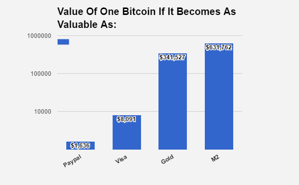 Теперь, когда биткойн достиг рекордных высот, и нет ориентиров оценить насколько он недооценен или переоценен, многие думают: «Наверное, этот поезд уже ушел». Один из вариантов, как я думаю, следующий: «Может ли биткойн или другая криптовалюта достичь рыночной капитализации Visa«? Или, возможно, вытеснить Visa? Может ли такая криптовалюта стать чем-то вроде цифрового золота? Может ли она заменить доллар в качестве мировой резервной валюты? Если ваш ответ «да» на любой из этих вопросов, то цена биткойна может, по крайней мере, учетвериться: