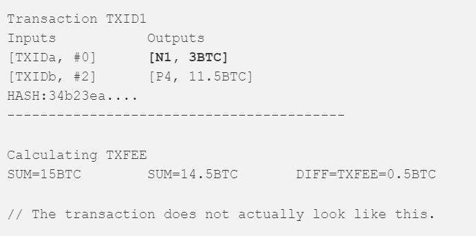 Возьмем вход N1. Предположим, что он был частью транзакции TXID1 и выхода #0. Тогда транзакция TXID1 выглядела бы следующим образом.