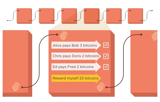 Важной идеей блокчейна Биткойна является то, что транзакции встраиваются в блоки перед добавлением в базу данных блокчейна. Блоки содержат некоторые биткойн-транзакции (платежи), а также прочие данные, включая хэш предыдущего блока. Поскольку каждый блок включает хэш предыдущего блока как часть своих данных, формируется цепочка блоков.