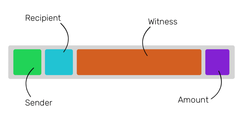Если углубиться дальше и рассмотреть, что представляет собой единичная транзакция, то обнаружится, что помимо очевидных данных — адреса отправителя, получателя, суммы и комиссии, она содержит то, что принято называть «Подпись», «Подтверждение» (данные свидетеля или «Witness»). Эта информация подтверждает наличие у отправителя нужной суммы, указанной им в транзакции. Данные из этой части используются только один раз в самом начале, но в итоге их «вес» в самой транзакции достигает 65%.