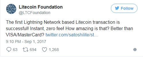 Фонд Лайткойн недавно написал в твиттере, что первый платеж сети Lightning Network был успешным, что указывает на то, что сеть завершила тестирование и готова к транзакциям. Сделка была отправлена с комиссией в размере $ 0.