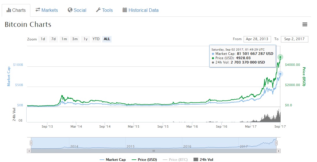 Это был невероятный год для криптовалют, так как капитализация крипто рынка выросла до огромных $176,9 млрд. Биткойн, криптовалюта номер один, недавно достиг нового рекордного максимума, средний показатель — $4834,47, согласно CoinMarketCap, хотя цена на некоторых биржах значительно выше. На различных биржах, торговые пары выше $4900, а на Bittrex, в торговой паре LSK / BTC, цена Биткойна уже превысила $5000.