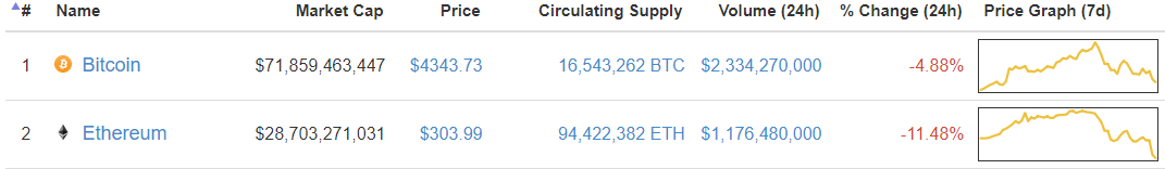 Биткойн выдержал шторм лучше остальных криптовалют, падение было на 5%. Это усилило распродажу, которая началась, когда цена Биткойна коснулась $5000, 2 сентября. Биткойн понизился почти на $700. И сейчас, цена Биткойна — $4282, капитализация — $66 млрд.