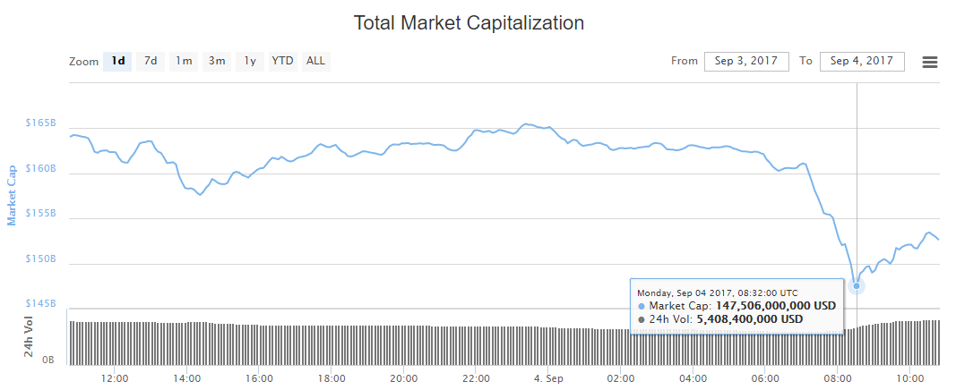 Эта паника инвесторов способствовала уменьшению капитализации всех цифровых валют. Вчера, стоимость крипто рынка была $164 млрд, что на $16 млрд, меньше чем 2 сентября. Решение Народного банка Китая (PBoC) объявить ICO вне закона, снизило капитализацию до $150 млрд.
