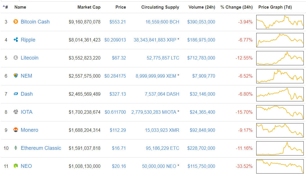 Судя по всему, цена bitcoin cash, что уменьшилась на 4%. Цены Ripple, NEM и Dash снизились на 7%, а цена Лайткоина на 13% до $67. Цена Лайткоина опустилась почти на $30, достигнув пика выше $90 на прошлой неделе.