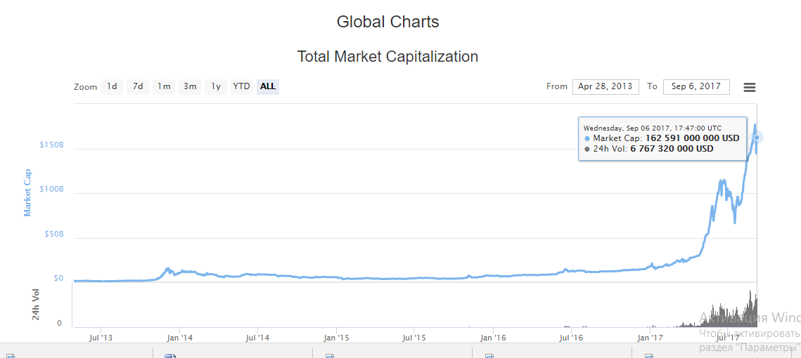 Рынок криптовалют восстанавливается после очередного удара от Китая, капитализация растет и уже достигла 162 млрд поднявшись после падения к 137 млрд набрав 25 млрд всего лишь за двое суток.