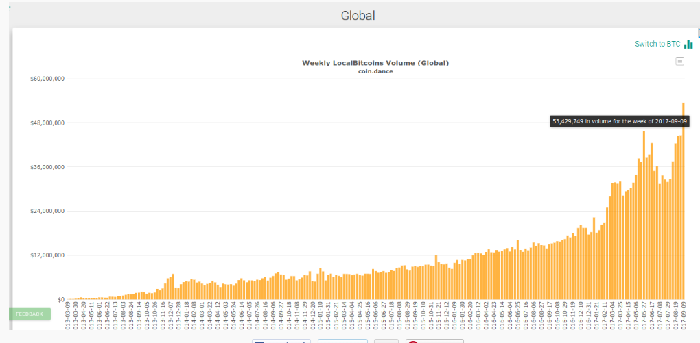 Данные из Coin Dance показывают новый еженедельный максимум для глобальных торгов на Localbitcoins, с переходом на $ 53,4 млн. В неделю, закончившуюся 9 сентября.