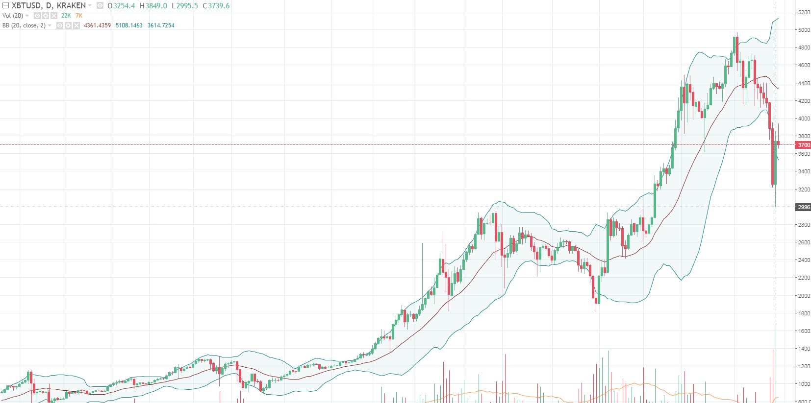 Биткойн завершил 61,8% уровень Фибоначчи от $1752 до $4975. Агрессивные покупатели воспользовались резким падением и инициировали длинные позиции около $2970, что и стало важной поддержкой.