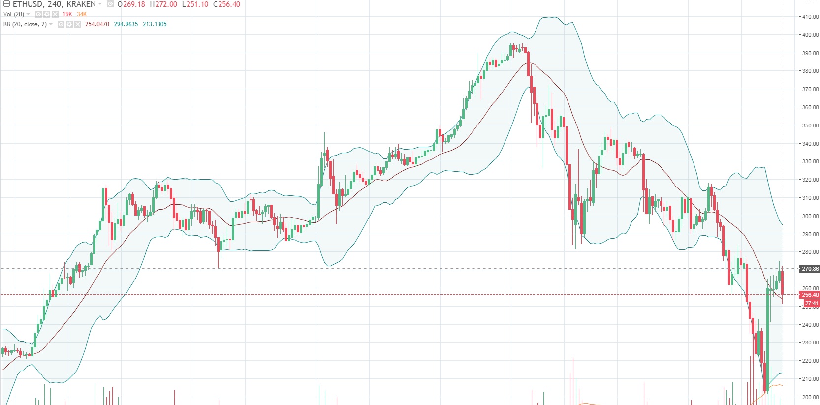 Эфириум сделал прорыв ниже 61,8% Фибоначчи с $129,78 до $409,42. Однако сильное давление продаж приблизила цену к $200.