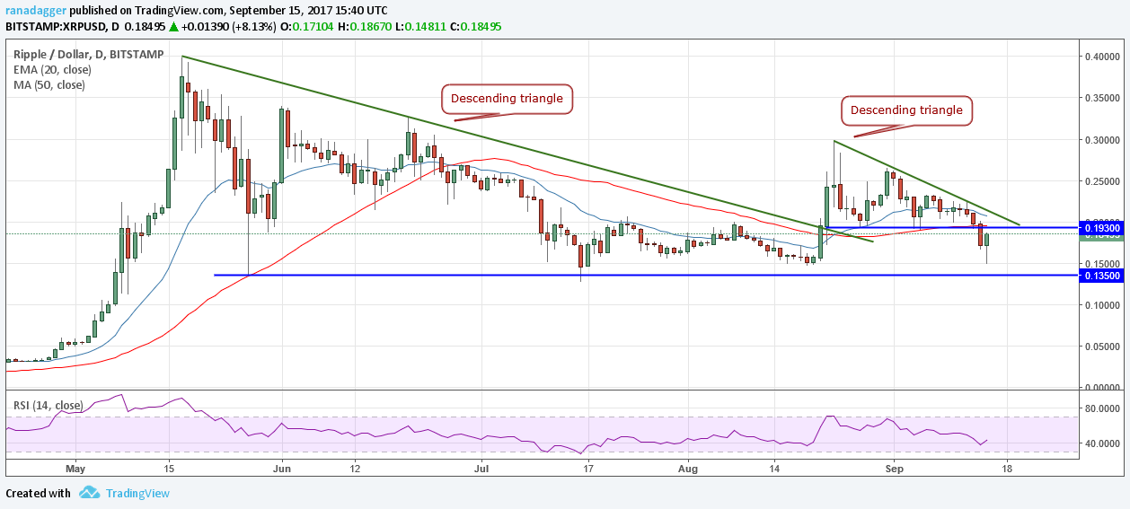 Сейчас цифровая валюта находится в откате, и, вероятно, столкнется с сопротивлением на $0,19300. Если сопротивление удержиться, криптовалюта, скорее всего, снова снизится до $0,15000. Но, если цена прорвется, она может дойти до линии нисходящего тренда. Возможности для покупок следует искать только после того, как ripple выйдет из линии нисходящего тренда и уровня $0,19300.