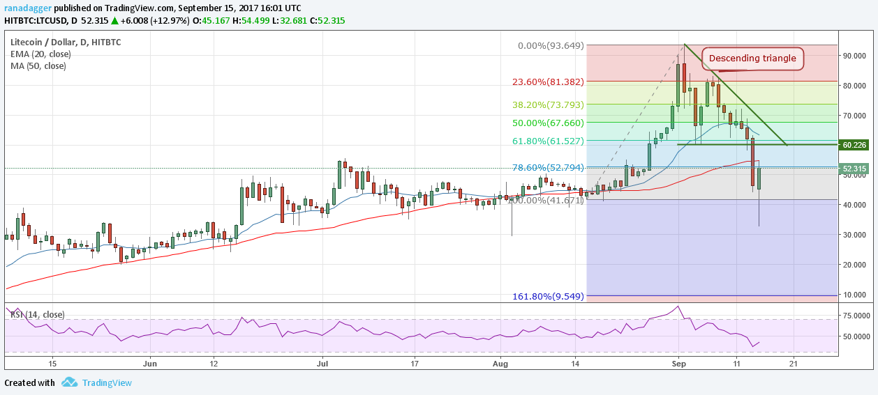 Лайткоин снизился ниже шаблона нисходящего треугольника, с целью в $30. Сегодня цифровая валюта приблизилась к своей цели и отступила оттуда. В настоящее время, монета выросла примерно на $20 от ее внутридневных минимумов дня, что свидетельствует об огромной волатильности.